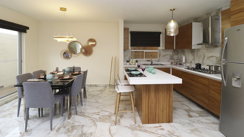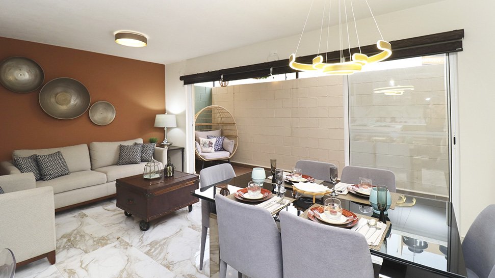 Sala-comedor, cocina, cuarto de lavado, medio baño para visitas, patio posterior, cochera techada, pasillo lateral y un espacio convertible que puedes ajustar según tus necesidades.
